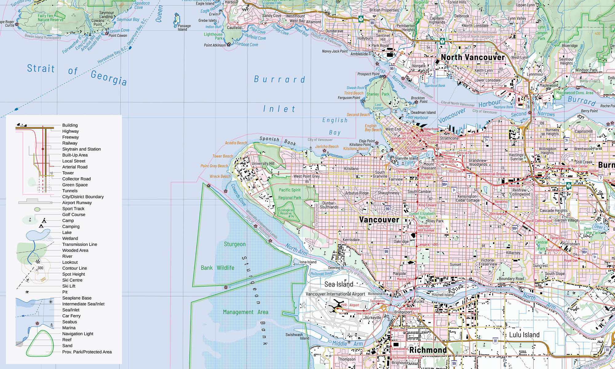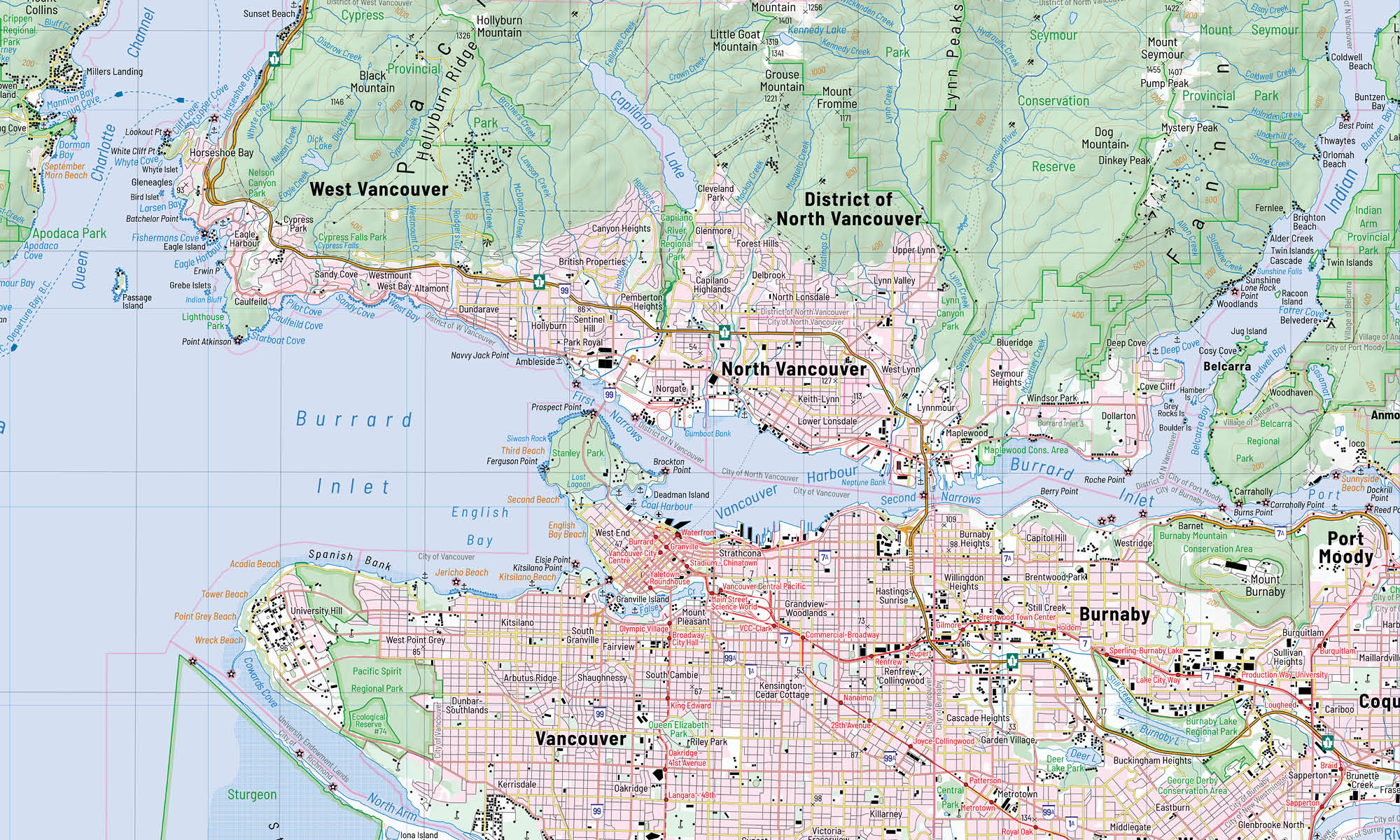 I would like to point out the use of red for train tracks which emphasize public transportation in a subtle